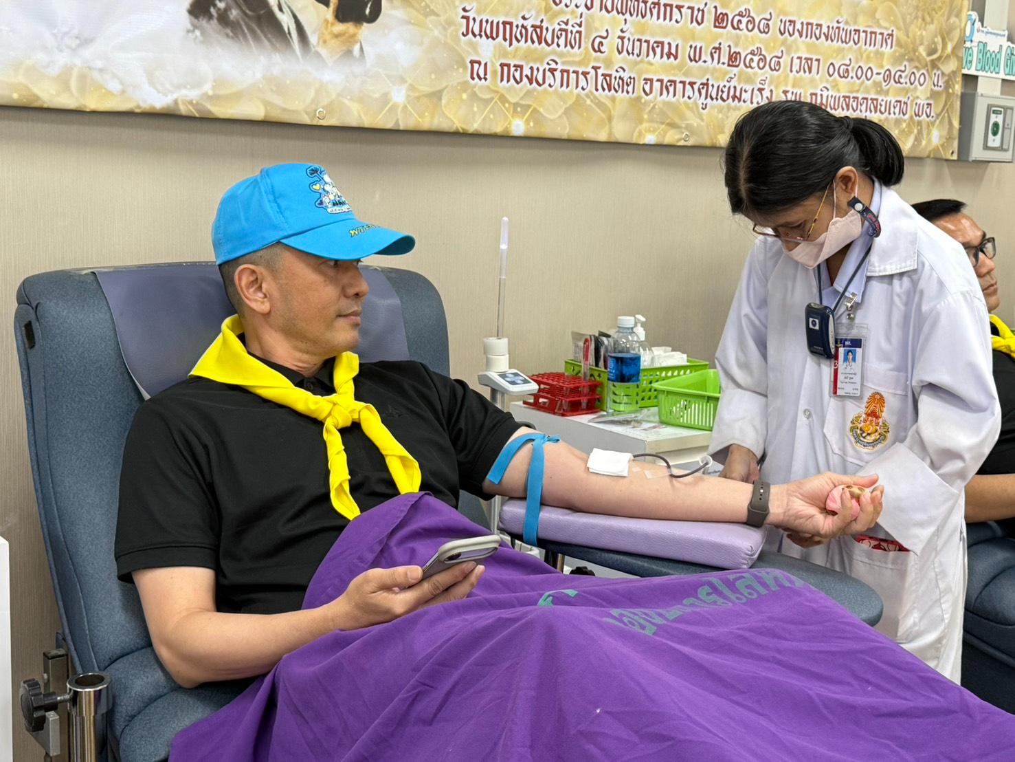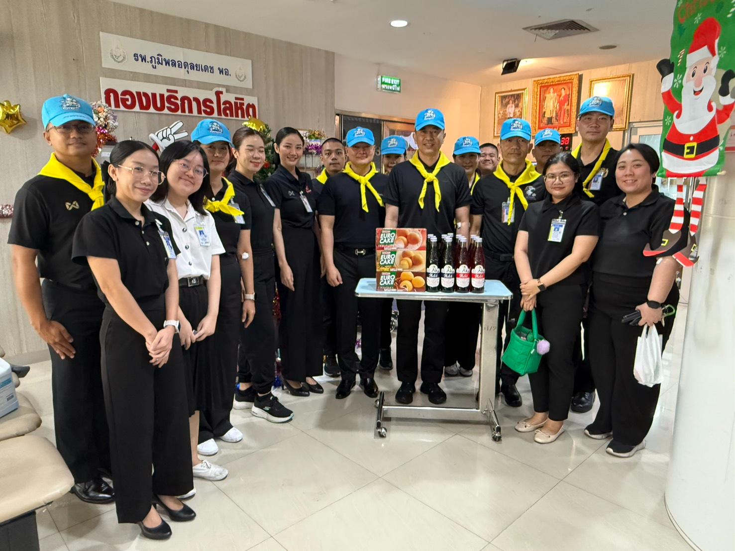 On Friday, December 19, 2025, from 10:00 AM to 12:00 PM, Group Captain Jakkapan Suksaengdao, Director of the Foreign Affairs Division, Office of Policy and Planning, Directorate of Intelligence, Royal Thai Air Force, led a delegation of personnel to participate in a volunteer blood donation activity. Organized under the theme of "Spreading the Spirit of Giving," the initiative aimed to provide vital support for patients in need. The event took place at the Blood Donation Room, 3rd Floor, Cancer Center Building, Bhumibol Adulyadej Hospital.