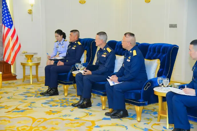และคณะ ซึ่งเดินทางมาแสดงความยินดีเนื่องในโอกาสที่ผู้บัญชาการทหารอากาศเข้ารับตำแหน่งใหม่ และหารือข้อราชการเกี่ยวกับโครงการความร่วมมือระหว่างกองทัพอากาศไทยและกองทัพอากาศสหรัฐอเมริกา ณ ห้องรับรองบริพัตร กองบัญชาการกองทัพอากาศ