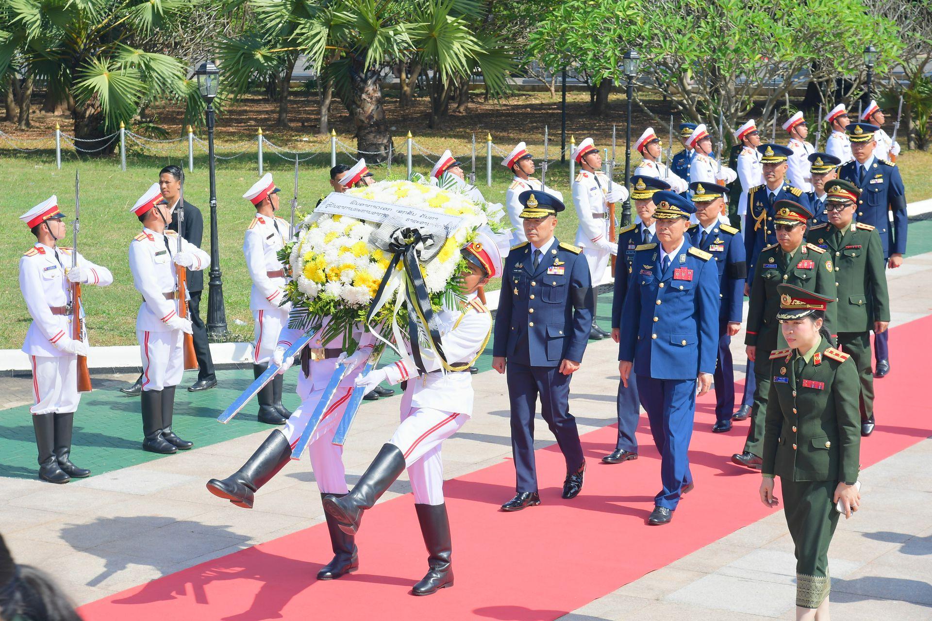 The LPA Air Force Commander graciously invited the RTAF Commander-in-Chief to inspect the Guard of Honor and subsequently paid a courtesy call where they exchanged views on official matters and presented souvenirs. Furthermore, the RTAF Commander-in-Chief traveled to lay a wreath in honor of the Monument of the Unknown Red Star Warrior of the Lao People's Army and attended an official luncheon at the Holiday Inn, Vientiane.